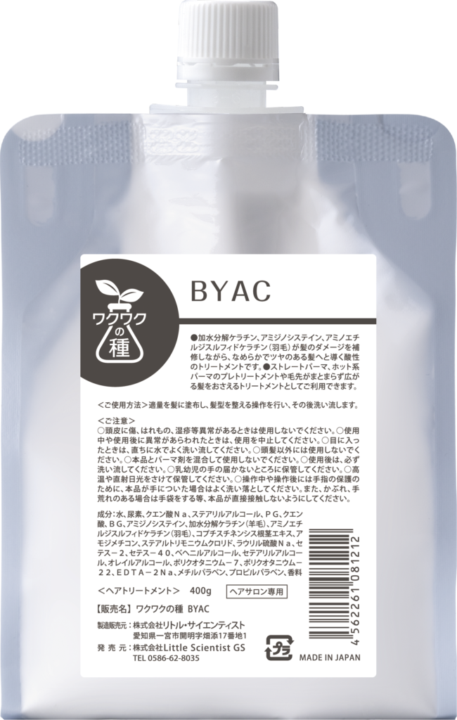 濡らすと伸びてしまうようなハイダメージ毛を補修するためにPPT、CMC をいくら導入しようとしてもS-S 結合の不足により、髪がすぐに膨潤するので補修成分がなかなか定着しません。BYAC はそんな髪にS-S 結合をつくり、髪内部を補修することで、次に行う施術のためのベース作りをします。